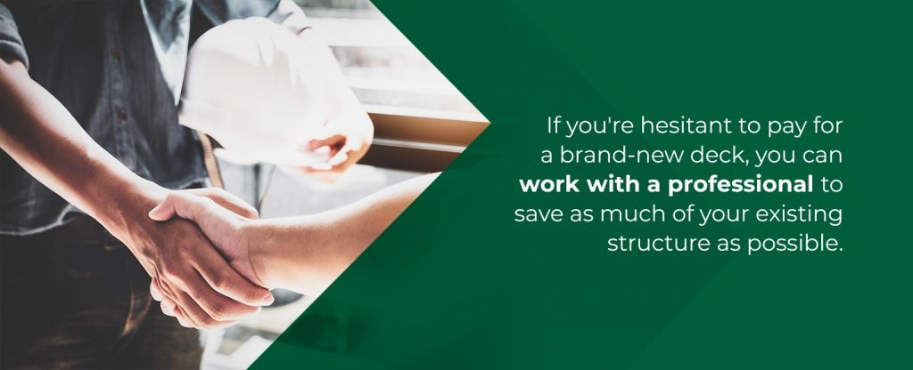 If you’re hesitant to pay for a brand-new deck, you can work with a professional to save as much of your existing structure as possible. After running tests to determine the sturdiness of your posts, joists and beams, they can give you an estimate of how much the new parts would cost and what they recommend replacing.